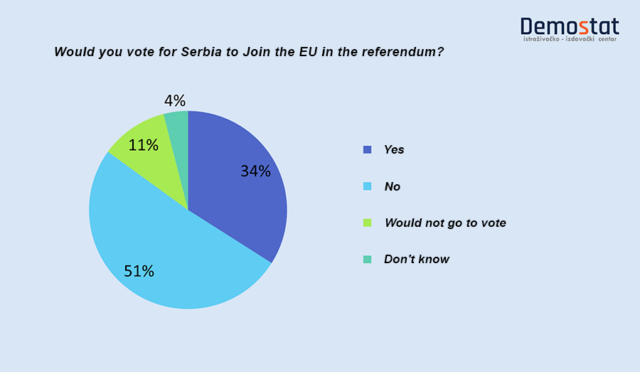 Only a third of citizens would vote for Serbias entry into the EU, while 51 percent would vote against it, according to the results of the latest Demostat survey, which showed that the attitude of public opinion towards the issue is the same as the attitude of the government and its media towards the EU. Such a mood of public opinion, which is largely a consequence of the pro-Russian narrative in Serbia, could be changed in the short term by the countrys president and the leader of the largest party, Aleksandar Vucic, Demostat interlocutors agree. This requires a clear decision by Vu?i?, a change in the narrative in the pro-government media, as well as the engagement of the party infrastructure and pro-Vucic-oriented representatives of the political and social elite.