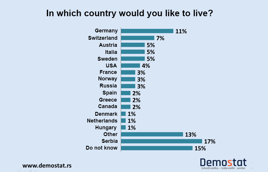 3) Germany (11%), Switzerland (7%), Austria, Italy, Sweden (5% each) are most often referred to as the countries in which the respondents would most like to live