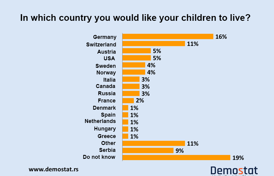 4) Respondents would recommend to their children to live and work in Germany (16%), Switzerland (7%), Austria and Italy (5%), Sweden and Norway (4%)...
