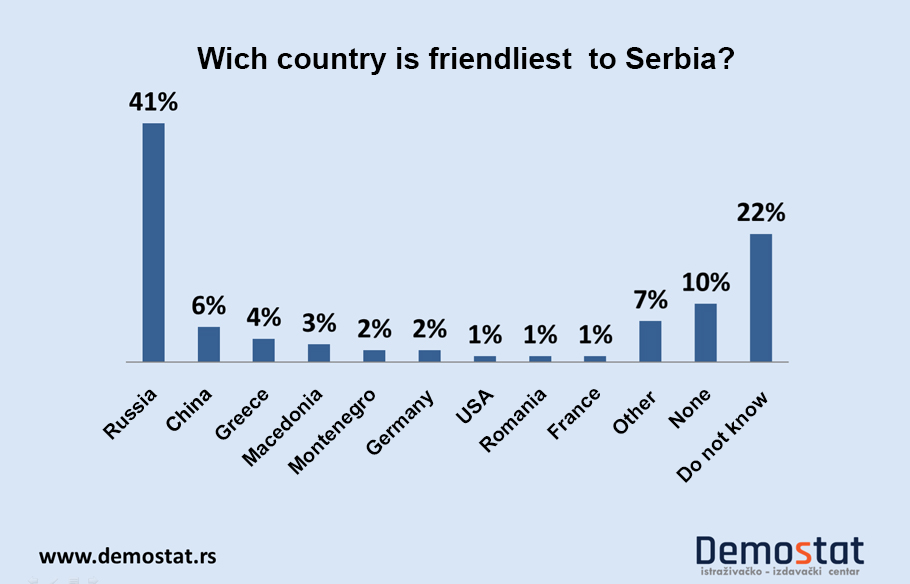 The Russian Levada centre has been systematically investigating, since 2006, which countries the Russian citizens consider to be friendly. In a survey conducted last year, Serbia is ranked the12th. Ranked better are: Belarus, Kazakhstan, China, India, Armenia, Cuba, Syria, Uzbekistan, Azerbaijan, Venezuela.