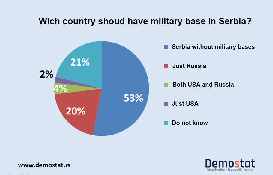 1) More than half of respondents wish for Serbia with no foreign military bases (53%), but if the bases must be present in Serbia, then the respondents choose Russian bases (20%)