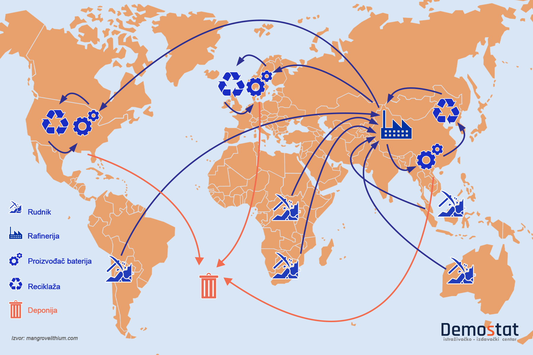 Sledeći grafikon pokazuje pozicije najvećih rudnika i lance snadbevanja litijuma širom sveta.