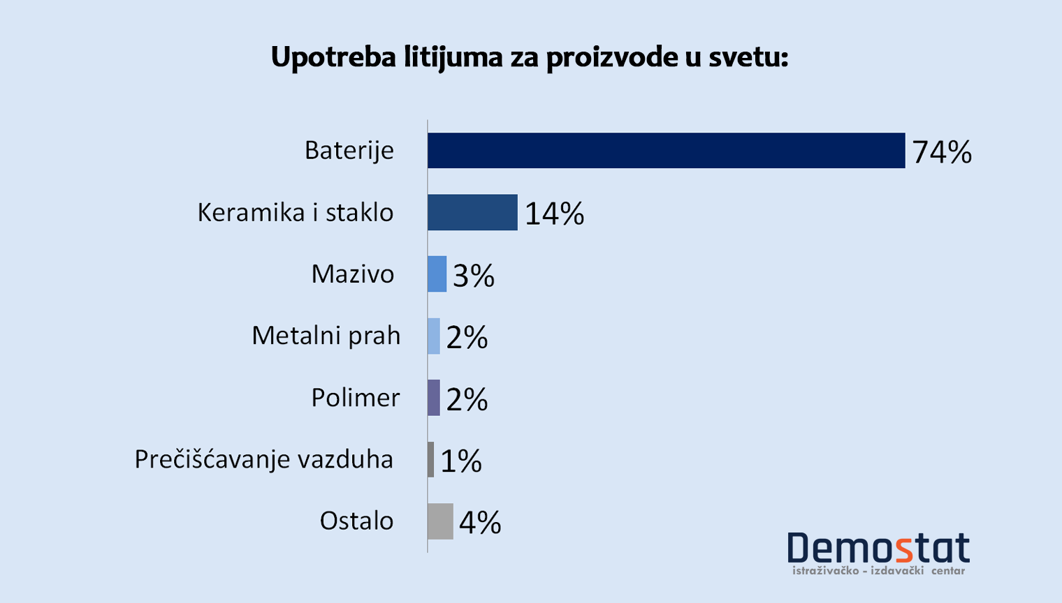 Danas je litijum najbolji nosilac punjenja u takozvanim sekundarnim baterijama i akumulatorima, ali se koristi i u druge svrhe, što pokazuje i sledeći grafikon.
