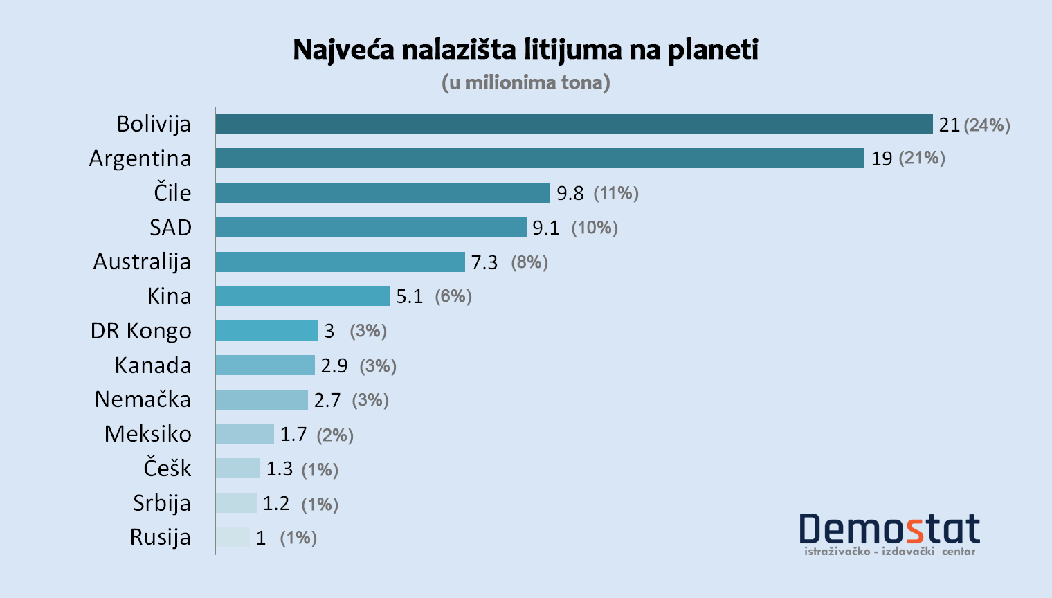 Sledeći grafikon prikazuje najveća nalazišta litijuma na zemlji sortirana po vodećim zemljama u milionima tona. Prema tom istraživanju iz 2022. godine, svetska količina litijuma je oko 89 miliona tona.
