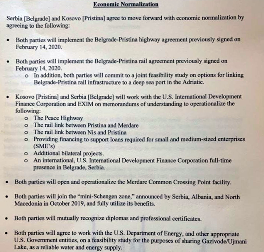 Nakon dugo najavljivanog istorijskog sastanka o odnosima Kosova i Srbije u Vašingtonu nije baš jasno šta je, ko i u čije ime zaista potpisao. Postoje papiri, penkala i ključevi Bele kuće koji su poklonjeni potpisnicima, postoji "razmena pismena" (ma šta taj termin značio), ali ne postoji potpisan akt koji bi imao karakter pravno obavezujućeg medjunarodnog ugovora. Sudeći po tumačenjima domaćih i inostranih eksperata, pre je reč o nekoj vrsti pisma o namerama nego o ugovoru, a bivši predsednik Genralne skupštine Ujedinjenih nacija (UN) Vuk Jeremić kaže da nikada nije video takav medjunarodni dokument.