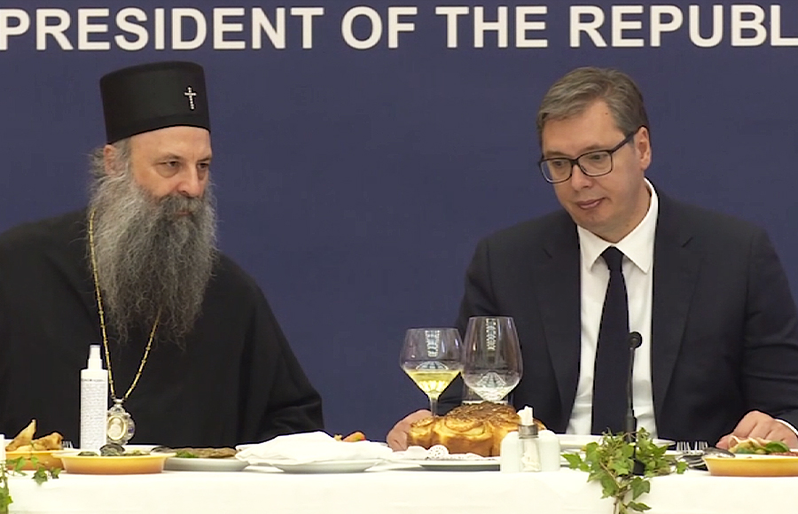 Scena je bila kao iz pretkosovskog ciklusa iako je vreme pokosovskog - četrdesetak najviših crkvenih velikodostojnika na Andrićevom vencu kod predsednika Aleksandra Vučića. Takođe, u svojstvu "domaćina, kao da je kopredsednik Srbije i Milorad Dodik, član Predsedništva BiH. Serviran ručak za dugačkom trpezom za kojom sede vladike u crnim odelima, kojima kontrast čini bela haljina Suzane Vasiljević, savetnice za medije predsednika Srbije. Vizuelna poruka skupa na nivou kao kada su krajem 2019. izbile protestne litije u Crnoj Gori i kada je slika monaha i monahinja u demonstracijama bila svetska vest.