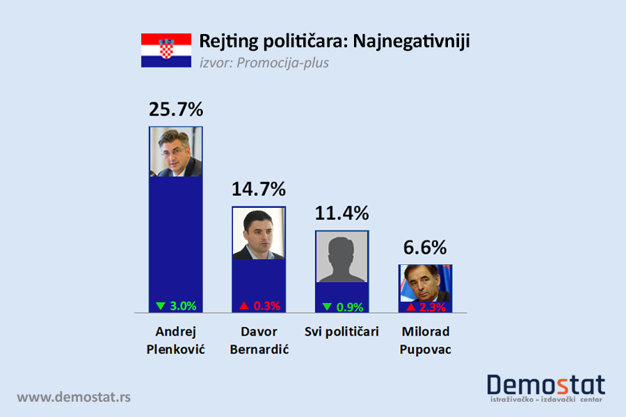 Zapravo nije novost da je nivo popularnosti premijera Plenković uveliko i konstatno niži od predsednice Grabar Kitarović. Podrška koju uživa u biračkom telu od 8,5 odsto niža je vrlo malo u odnosu na jul mesec, kada je zabeleženo 9,1. Međutim, popularnost premijera Plenkovića beleži vrlo ubedljivo prvo mesto u negativnom kontekstu. Rezultati istraživanja pokazuju da je na vrhu lestvice negativnog doživljaja hrvatskih političara upravo predsednik tamošnje vlade - 25,7 odsto. Na drugom je mestu Davor Bernardić koji beleži negativnu ocenu od strane 14,7 odsto ispitanika, dok su na trećem mestu "svi političari" kao zasebna kategorija odgovora sa izborom od 11,4 odsto. Četvrto mesto drži Milorad Pupovac sa 6,6 odsto, a slijedi Zlatko Hasanbegović sa 5,4 odsto… U kontekstu negativnog doživljaja, predsednica Hrvatske se kreće na nivou statističke greške.