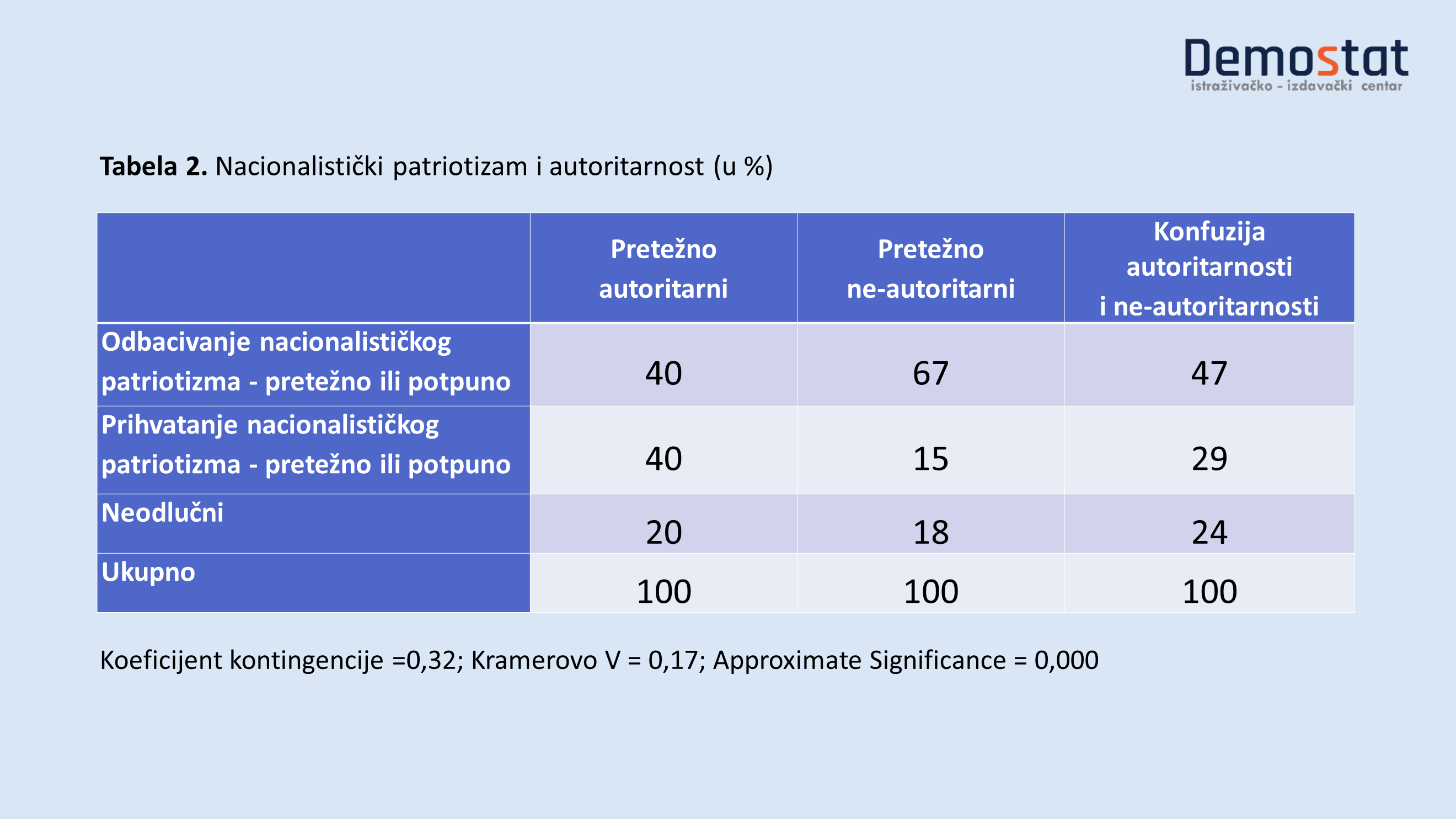 Pretežno autoritarni ispitanici su podeljeni na dve petine onih koji odbacuju nacionalistički patriotizam i isto toliko onih koji prihvataju (petina ima konfuzni odnos prema autoritarnosti). Dve trećine neautoritarno orijentisanih ispitanika (67 posto) odbacuje nacionalistički patriotizam, a 15 posto prihvata (18 posto je konfuzno) - videti tabelu 2. Povezanost ove dve varijable je osrednjeg intenziteta (koeficijent kontingencije iznosi 0,32).