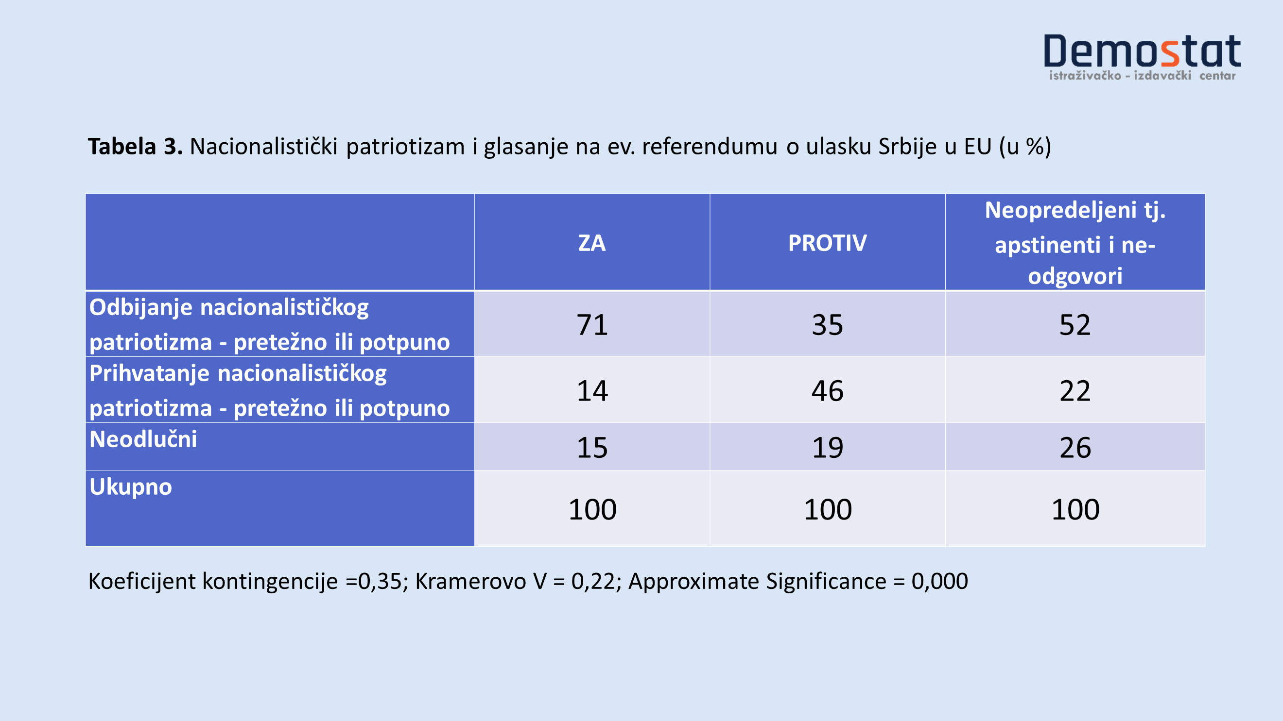 Možemo zaključiti uz dosta uopštavanja da je javno mnenje Beograđana početkom decembra prošle godine gotovo podjednako razdeljeno na trećinu onih koji su za ulazak Srbije u Evropsku uniju, trećinu onih koji su protiv i trećinu onih koji su neopredeljeni. Ispitanici koji su za ulazak Srbije u EU tročetvrtinski su protivnici nacionalističkog patriotizma, dok su ispitanici koji su protiv ulaska Srbije u EU gotovo podjednako podeljeni na protivnike i pristalice nacionalističkog patriotizma. Blaga većina ispitanika koji su neopredeljeni prema ulasku Srbije u EU odbacuje nacionalistički patriotizam, a prihvata ga jedna četvrtine ove grupe ispitanika. Ovakva distribucija odgovora ukazuje na verovatnoću daljeg smanjivanja nacionalističkog patriotizma i na verovatniji trend orijentacije na ulazak Srbije u Evropsku uniju, kada je reč o punoletnim Beograđanima.