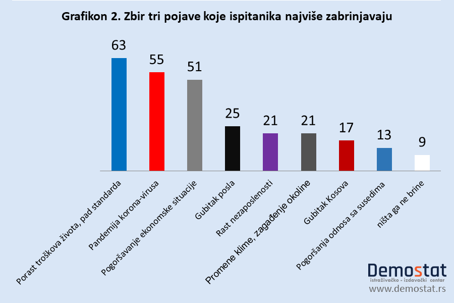 To se vidi na grafikonu koji predstavlja odgovore na pitanje o zabrinutosti građana – 63% se plaši zbog pada standarda, 55% je zabrinuto zbog korone, 51% zbog ekonomske situacije. Tek na donjem delu tabele se brinu zbog Kosova, njih 17%.
