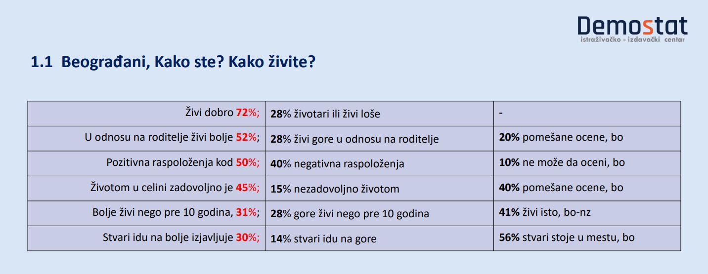 O zadovoljstvu životom zaključivali smo na osnovu odgovora na pitanje „Kako ste? Kako živite vi i vaša porodica?“ sa ponuđenim odgovorima; veoma dobro, dobro, jedva sastavljam kraj s krajem, loše i veoma loše. Prva dva odgovora spojili smo u kategoriju „dobro živimo“, a ostale odgovore u kategoriju „loše živimo“. U istraživanju Demostata, obavljenom u decembru prošle godine na uzorku od 1200 Beograđana (region Beograd) našli smo da je 31 posto Beograđana reklo da živi loše a da je 69% reklo da živi dobro. Inače korelacija sa odgovorima na klasično pitanje o zadovoljstvu životom veoma je visoka (0,57).