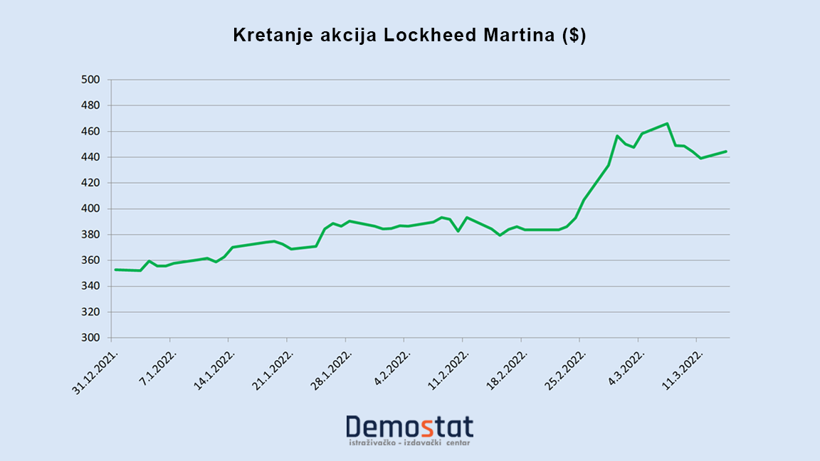 Akcije ove kompanije su pre početka rata u Ukrajini vredele oko 210 dolara dok danas već vrede 235 dolara, mada su u jednom trenutku dogurale i do 255 dolara. Najava da će se proširiti nemački budžet za odbranu stavlja Lockheed Martinov F-35 stelt lovac u kategoriju mogućih kupovina, baš kao i kupovinu Boeingovih jurišnih helikoptera Apache.