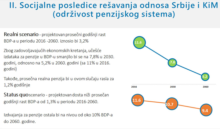Godišnji rast BDP-a bi, prema prvom scenariju za period od 2016-2060. godine iznosio 3,2 odsto (u 2017. godini je bio 1,9 odsto, a u 2018. 4,4 odsto - Republički zavod za statistiku), penzija bi rasla za 1,2 odsto godišnje, dok bi u slučaju suprotnog scenarija rast u istom periodu bio 1,3 odsto, a izdvajanja države za penzije oko 10 odsto BDP-a (danas je oko 11 odsto).
