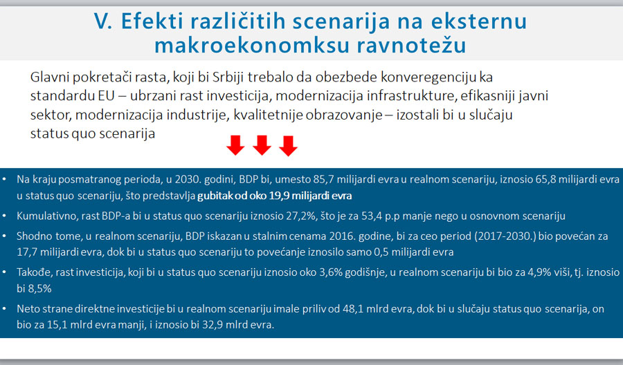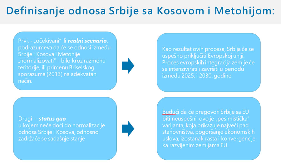 Zemlja bi, u slučaju ovog scenarija koji se naziva i proinvesticioni, ušla u Evropsku uniju između 2025. i 2030. godine, dok bi, u slučaju statusa kvo, koji se naziva i “konzervativnim” scenarijom, došlo do pogoršanja ekonomskih uslova, izostanka rasta i udaljavanja od Evropske unije.