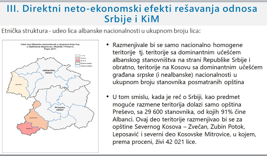 Studija koju je uradio tim sa Kovačevićem na čelu, iz koje Vučić crpi argumentaciju, evolucija je ovakvog pristupa rešavanju problema. U njoj se scenario podele, odnosno “razmene” teritorija po etničkom principu (sever za Preševo), uvodi kao “realni scenario”, realan koliko i primena Briselskog sporazuma koja ne uključuje razmenu. Težište je pomereno sa istorijskih na ekonomske razloge, odnosno glavno pitanje je koliko državu košta teritorija na kojoj samo prividno ima kontrolu. Ova računica je potkrepljena projekcijama demografskih i socijalnih kretanja.