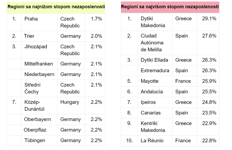 - Nemačka se očekivano nalazi na popisu jer je najjača privreda u EU. Glavni razlozi niske nezaposlenosti u Češkoj odnosno najniže stope nezaposlenosti u EU su veliki udeo industrijske proizvodnje u BDP-u, primera radi Toyota, Peugeot, Citroën, Škoda, Hyundai, i snažna povezanost odnosno međuzavisnost sa poslovnom aktivnosti EU koja ima rast od 2,2 odsto. Većina regija sa najvišom stopom nezaposlenosti se nalaze u Grčkoj i Španiji. Te dve zemlje imaju najveće stope nezaposlenosti u EU.Glavni razlozi visoke nezaposlenosti u Grčkoj su ekonomska politika štednje uvedene od kreditora zbog grčke prezaduženosti i nesprovođenje strukturnih reformi. Visoka nezaposlenost u Španiji se najviše manifestuje zbog restriktivnog zakonodavnog okvira i anemičnog ekonomskog rasta - ističe Vrančić.