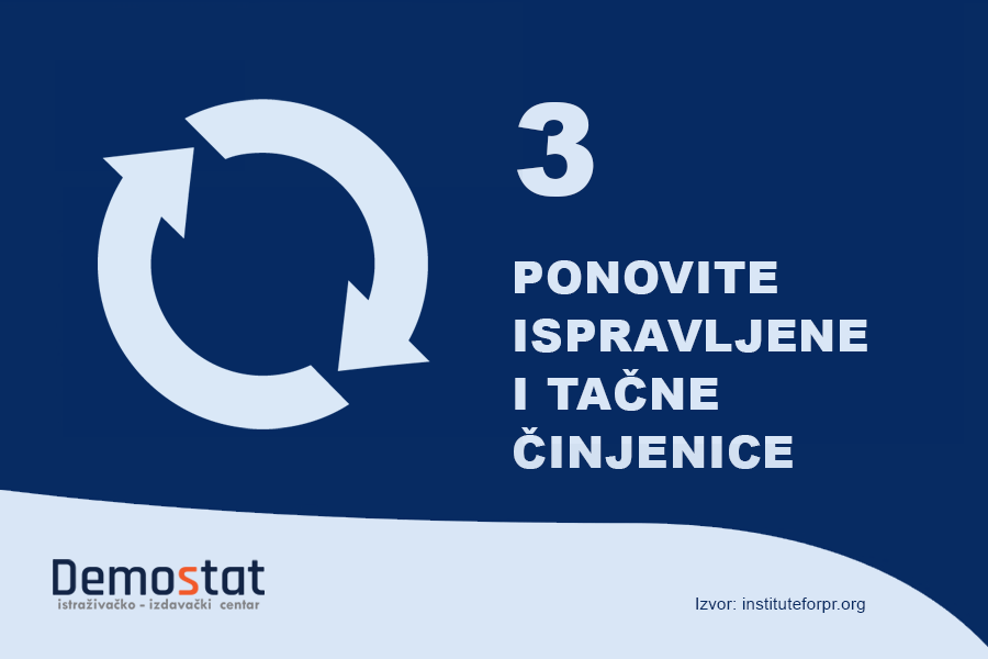 Prema stručnjacima za bihevioristiku, ljudi su skloni tome da informacije koje im deluju poznatije smatraju istinitijim. Ponavljanje protivargumenata i ispravljenih navoda pomoći će da konzument sadržaja bude izloženiji istinitom narativu, što će u krajnjoj liniji doprineti tome da konzument oformi stavove koji će biti utemeljeni na tačnim, istinitim i proverenim informacijama.