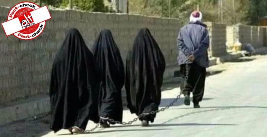 Na fotografiji koja je izazvala veliku pažnju na društvenim mrežama vide se tri žene u burkama ispred kojih hoda muškarac. Na fotografiji se čini da su one vezane lancem, a da ih muškarac vuče. Međutim, snimak je iz Iraka, datira još iz 2003. godine, a lanac kojem su žene navodno vezane je dodat fotošopom.