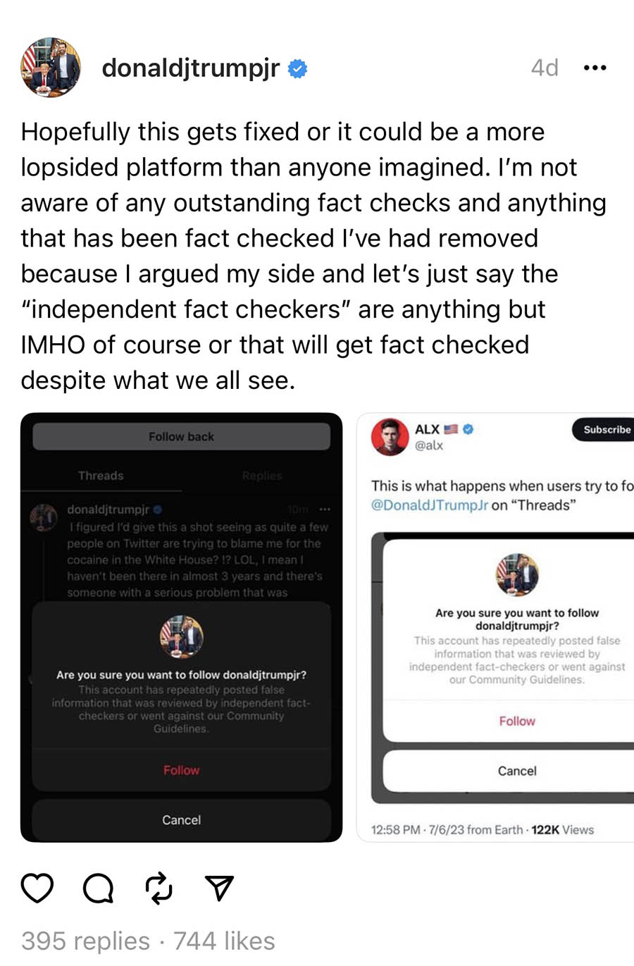 Korisnici Tredsa koji su pokušali da prate najstarijeg sina 45. predsednika SAD dočekani su porukom: „Da li ste sigurni da želite da pratite ovaj nalog?“, uz objašnjenje da je taj nalog više puta provereno objavljivao lažne informacije ili postupao u suprotnosti sa smernicama Meta zajednice.