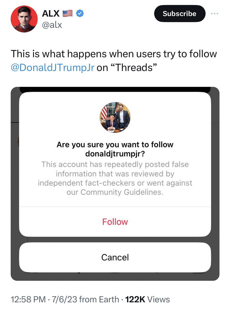 Treds (Threads), nova društvena mreža kompanije Meta koja je za nedelju dana prikupila više od 100 miliona korisnika, pokrenula je više kontroverznih pitanja, od kojih se jedno tiče i borbe protiv širenja dezinformacija i štetnih sadržaja. Da li je upozorenje upućeno korisnicima da su pojedini nalozi povezani sa dezinformacijama– borba protiv lažnih vesti ili cenzura? Zavisi iz kog ugla posmatramo.