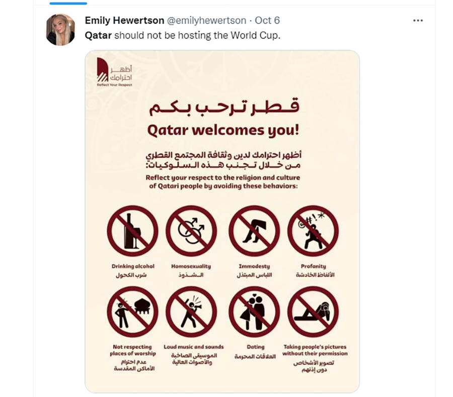 Potražite Katar na Tviteru i rezultati vođeni algoritmima će pokazati objavu, koju je tvitovalo i nekoliko verifikovanih naloga, na kojoj se posetioci pozivaju da poštuju niz pravila, kao što su uzdržavanje od alkohola, psovanja, glasne muzike, izlazaka, a navodno je zabranjeno i ispoljavati seksualnu orijentaciju prema suprotnom polu.