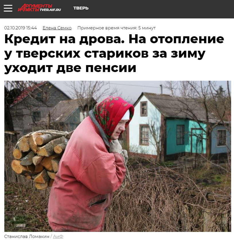 U članku objavljenom još u oktobru 2019. godine navodi se da su zbog hladnog leta mnogi penzioneri potrošili ionako oskudnu zalihu ogrevnog drveta, jer se „bez hleba može živeti, ali bez ogreva ne može“. U članku se pominje i da trinaest okruga Tverske oblasti nije snabdeveno gasom, a jedini način da se stanovništvo ne smrzava zimi je kupovina ogrevnog drveta koje košta oko 20 hiljada rubalja. Istovremeno, penzije su veoma male, pa je starijima teško da sebi obezbede ogrev.