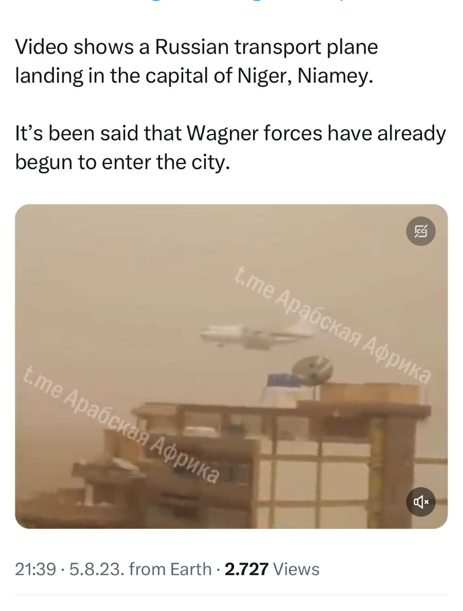 Na društvenim mrežama kruži video snimak ruskog vojnog aviona koji navodno sleće u Nijamej, glavni grad Nigera, uz spekulacije da su „Vagnerove snage već počele da ulaze u grad“.