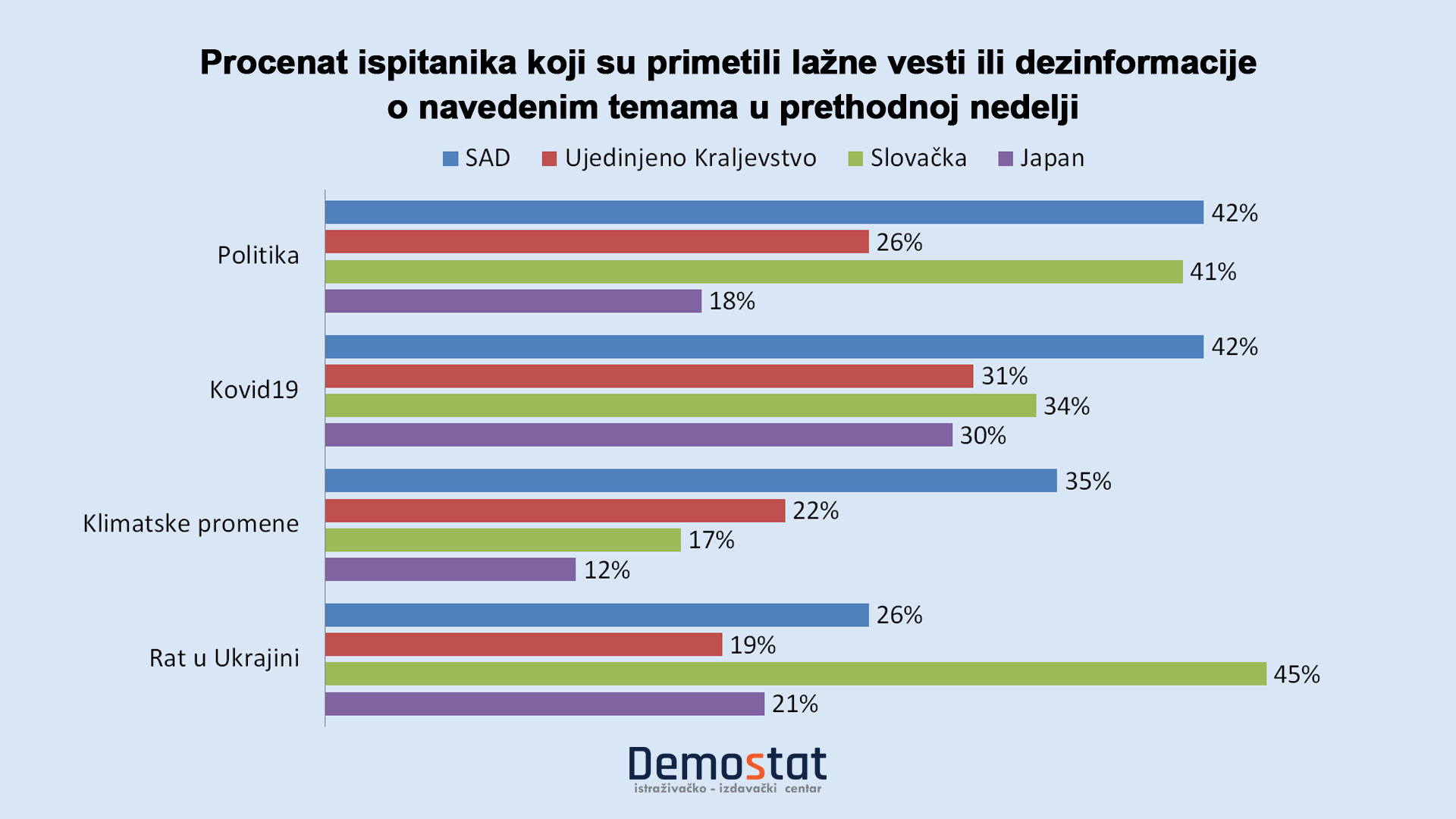 Tako, na primer, u Slovačkoj, jednoj od zemalja koje se graniče sa Ukrajinom, skoro polovina ispitanika navodi da je prethodne nedelje videla dezinformacije o sukobu u toj zemlji. To je oko dva puta više nego u Velikoj Britaniji, Sjedinjenim Državama ili Japanu.
