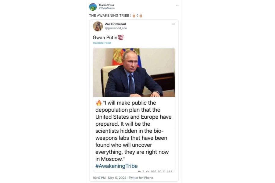 Ova tvrdnja se prvenstveno proširila na platformama društvenih medija, uključujući Tviter i Fejzbuk. Dobar primer za ovo jeste jedan tvit iz maja ove godine kada je sa naloga @grimvood_zoe podeljen snimak ekrana citata objavljenog u aplikaciji za razmenu poruka Telegram, koji je prikupio više od sedam hiljada dve stotine lajkova i tri hiljade četiri stotine retvitova do avgusta ove godine. Tvit je kasnije podelio nalog @VilesSharon, koji je, pak, prikupio više od šest hiljada dve stotine lajkova i tri hiljade sto retvitova do avgusta ove godine.