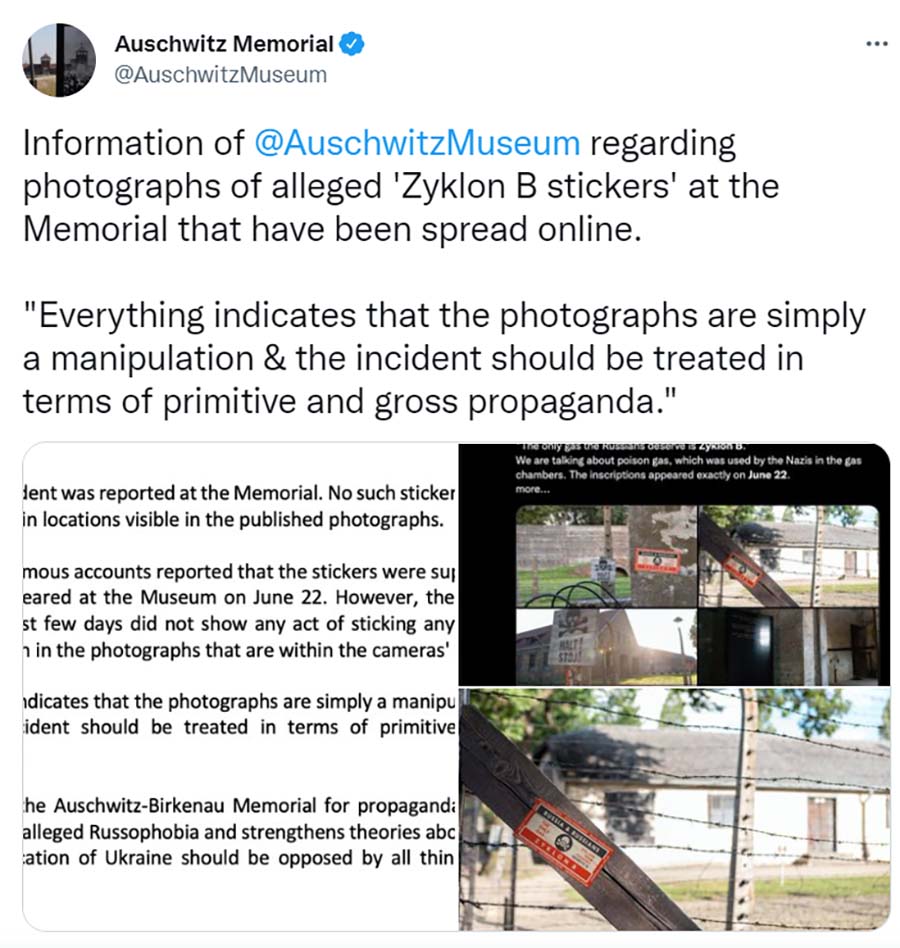 Na zvaničnom Tviter nalogu spomen kompleksa i muzeja Aušvic-Birkenau objavljeno je saopštenje da: ,,Takav incident nije prijavljen. Takve slike nisu pronađene... Sve ukazuje na to da su fotografije samo manipulacija i da se incident treba da se tretira kao primitivna i gruba propaganda.” Zvaničnici iz ovog spomen kompleksa i muzeja, koji je nastao na mestu nekadašnjeg koncentracionog logora, takođe su saopštili da na njihovim bezbednosnim kamerama nije snimljeno da iko stavlja nalepnice o kojima je reč na lokacije vidljive na fotografijama koje su kružile internetom.