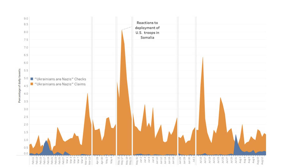 Kao što se vidi na grafiku 2, 17. maja se primećuje najveći porast tvitova u kojima se iznosi ta tvrdnja. Iako se datum poklapa sa predajom Ukrajinaca koji su branili čeličanu Azovstal, većina korisnika se zapravo bavila preraspodelom kopnenih snaga u Somaliji, koju je prethodnog dana najavio američki predsednik Džo Bajden.