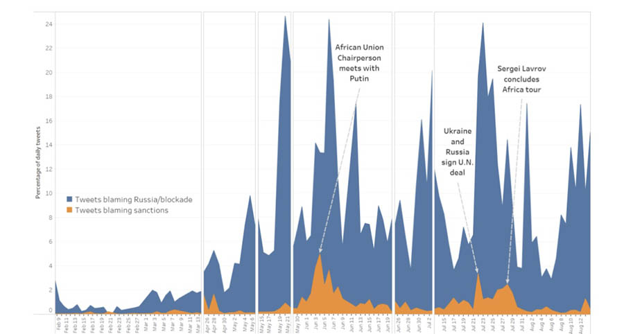Najveći nalet tvitova u kojima se tvrdi da je Zapad, zbog sankcija Rusiji, odgovoran za moguću nestašicu hrane, dogodio se 4. juna, jedan dan nakon sastanka Vladimira Putina sa predsedavajućim Afričke unije i predsednikom Senegala Maki Salom. Drugi talas tvitova u kojima se okrivljuju sankcije dogodio se onog dana kada su Ukrajina i Rusija potpisale sporazum o žitu uz posredovanje Ujedinjenih nacija i Turske. Rast broja takvih tvitova se nastavlja do kraja jula zbog turneje šefa diplomatije Rusije Sergeja Lavrova po Egiptu, Etiopiji, Ugandi i Republici Kongo. Otkako je potpisan ugovor o žitu, u većini tvitova koji krive Zapad citiraju se izjave Sergeja Lavrova tokom afričke turneje, uključujući i to da raketni udari na luke u Odesi ne predstavljaju prepreku za isporuke žitarica.