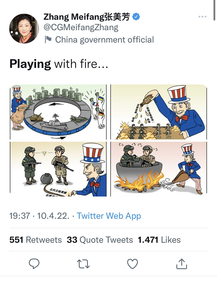 Nisu svi ovi profili povezani sa invazijom Rusije na Ukrajinu, ali svi imaju tendenciju da šire stavove kineske vlade. Sa tih naloga se kritikuje spoljna politika SAD i EU, s posebnim osvrtom na njihovu ulogu u Ukrajini i na Tajvanu. Vašington se optužuje da potpaljuje ukrajinsku krizu, kao i da je mozak iza sukoba u Ukrajini. Sa tih naloga se napada kineski milijarder u egzilu i jedan od glavnih kritičara kineskog predsednika, Guo Vengui, ali i hvali odgovor Kine na korona krizu. Lažni nalozi dele sadržaj sa profila kineskih zvaničnika, a dele se i snimci američkih i evropskih političara koji kritikuju povećanu ulogu zapada u Ukrajini, poput Viktora Orbana. Ti nalozi predstavljaju i platformu za zvaničnike Komunističke partije Kine, jer “bustuju” njihove profile.