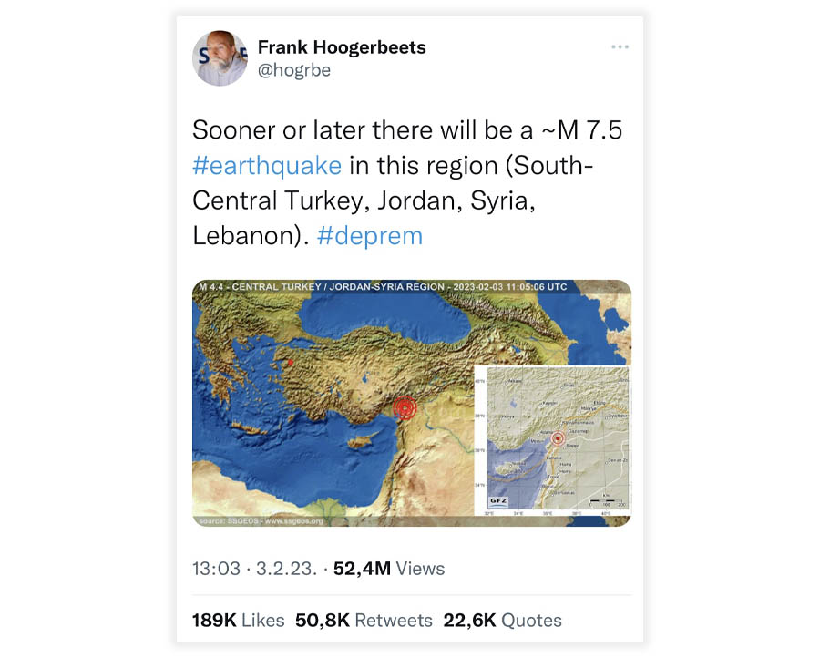 Jedna od njih pokrenuta je tvitom koji je nekoliko dana pre katastrofe objavio navodni istraživač, koji je napisao da će pre ili kasnije doći do zemljotresa jačine 7,5 stepeni Rihtera u regionu južne i centralne Turske, Jordana, Libana i Sirije. On se predstavlja kao istraživač u institutu koji se bavi praćenjem geometrije između nebeskih tela u vezi sa seizmičkom aktivnosću.
