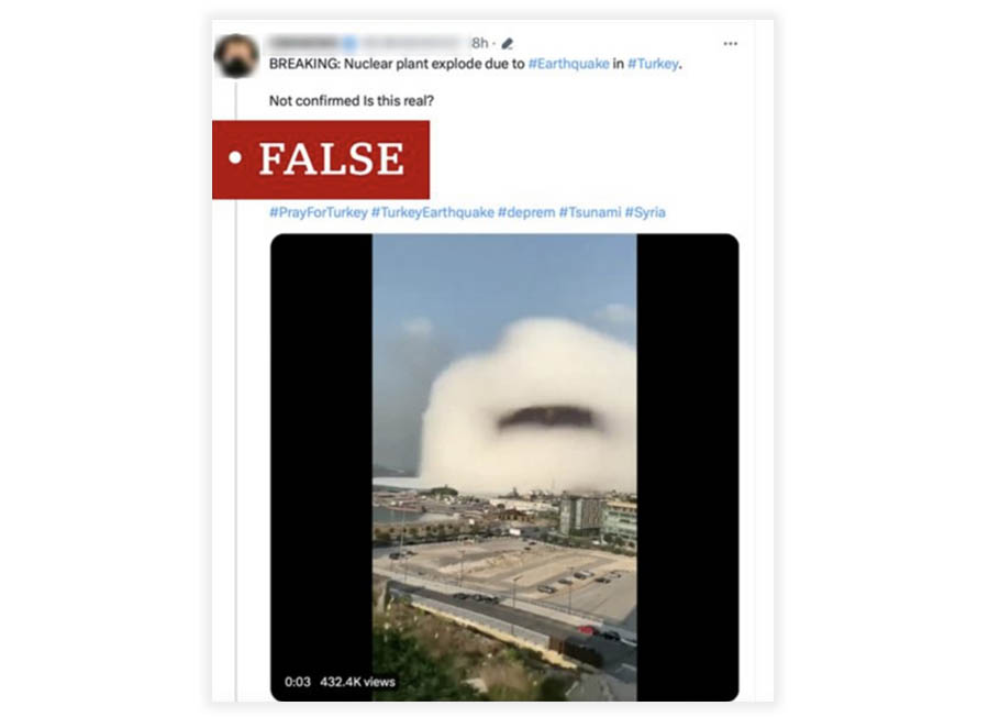 Verifikovani korisnik Tvitera CBKNEWS podelio je navodni snimak eksplozije nuklearne elektrane nakon zemljotresa, uz komentar da autentičnost još nije potvrđena. Objavu je videlo 1,2 miliona korisnika Tvitera, ali je ubrzo otkriveno da je reč o eksploziji koja se dogodila 2020. godine u Bejrutu.