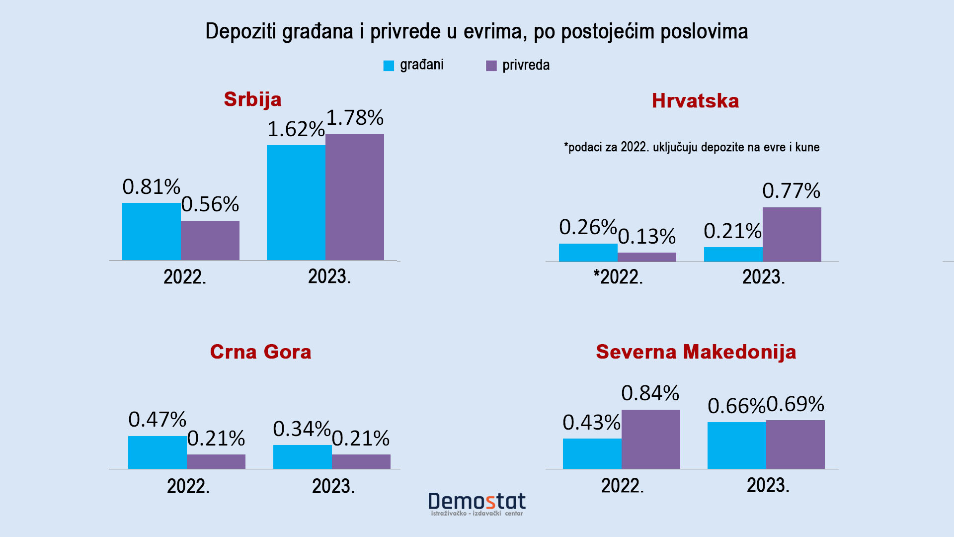 U Hrvatskoj su recimo kamate na nove depozite u evrima i dalje znatno manje nego kod nas (samo 0,15 odsto za stanovništvo i 1,29 odsto za privredu – u Srbiji 2,49 i 1,99 odsto), kao na postojeće depozite (0,21 i 0,77 odsto – kod nas 1,62 i 1,78 odsto).