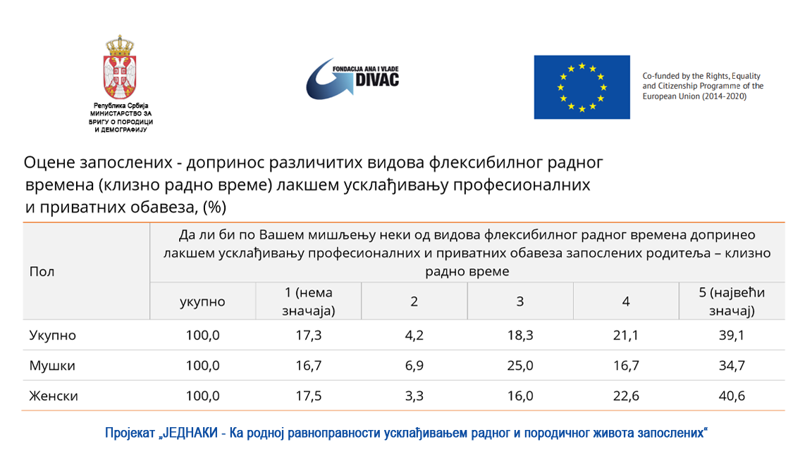 Ovaj tekst je izrađen uz finansijsku podršku Evropske komisije. Za sadržaj teksta isključivo su odgovorni Ministarstvo za brigu o porodici i demografiju i Fondacija Ana i Vlade Divac i ne može se ni pod kojim okolnostima smatrati da ovaj tekst predstavlja stavove Evropske komisije. Projekat „Jednaki - ka rodnoj ravnopravnosti usklađivanjem radnog i porodičnog života zaposlenih“ finansiran je iz programa Evropske unije „Prava, jednakost i državljanstvo (2014-2020)“.