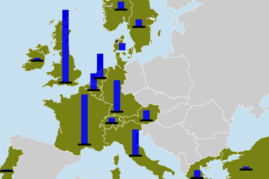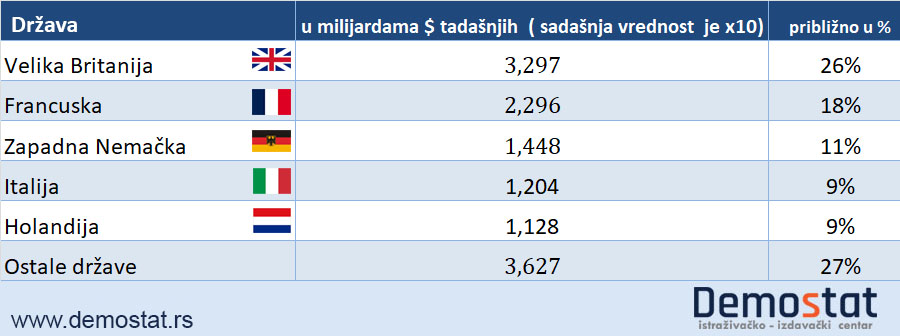 Najviše novca dobila je Velika Britanija (3,297 milijardi dolara – 26 odsto od ukupne sume), a slede Francuska (2,296 milijardi – 18 odsto), Zapadna Nemačka (1,448 milijardi – 11 odsto), Italija (1,204 milijarde) i Holandija (1,128 milijardi), dok su ostale države dobile manje o milijardu dolara.