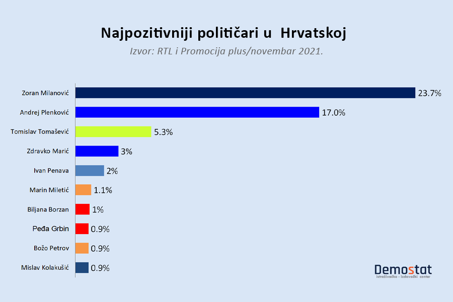 Dalje se navodi da su ispitanici za najpozitivnijeg političara odabrali predsednika Zorana Milanovića, koji je ostvario 23,7 posto za razliku od oktobra kada je postotak iznosio 21,9. Njegove verbalne okršaje s Vladom građani vide u pozitivnom svetlu. Premijer Andrej Plenković nalazi se na drugom mestu. Uz blagi pad rejtinga, Plenković je najpozitivniji političar za gotovo 17 posto ispitanika (u novembru ih je bilo 17,5 posto). Iako se nalazi na trećem mestu, zagrebački gradonačelnik Tomislav Tomašević gotovo je prepolovio svoj rejting odoktobra. Tada je imao 9,9 posto, dok danas beleži 5,3 posto.
