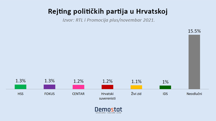 HSS i FOKUS imaju svaki po 1,3 posto, CENTAR i njihov novi predsednik Ivica Puljak 1,2 odsto, a isti rejting prisutan je i kod Hrvatskih suverenista. Živi zid beleži, 1,1 posto, a IDS 1 posto. Neodlučnih je i dalje mnogo - čak 15,5 posto.