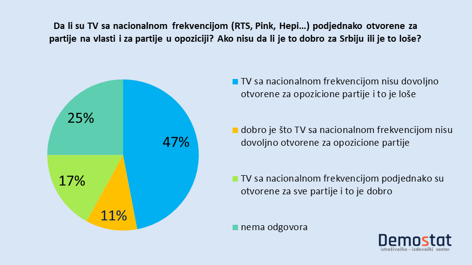 Naime, 47 odsto ispitanika smatra da televizije nisu dovoljno otvorene za partije opozicije i da je to loše za Srbiju.