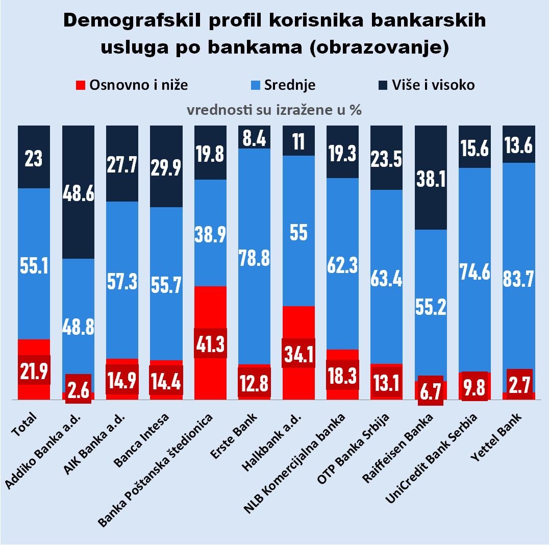 Osim Poštanske štedionice, visok udeo klijenata sa nižim stepenom obrazovanja ima i Halkbanka (34,1%) dok su sve ostale ispod proseka koji iznosi 21,9%. Klijenti sa srednjim obrazovanjem najbrojniji su u strukturi Yettel banke, čak 83,7%. Prosek je 55,1% a iznad te granice su još i Erste banka (78,8%), Unikredit (74,6%) kao i OTP, NLB Komercijalna, AIK banka i Rajfajzen. Najveći procenat visokoobrazovanih klijenata ima Adiko banka, čak 48,6%, a iznad proseka koji je 23% osim Inteze tu kategoriju korisnika imaju i Rajfajzen (38,1%) AIK banka (27,7%) i OTP banka (23,5%).