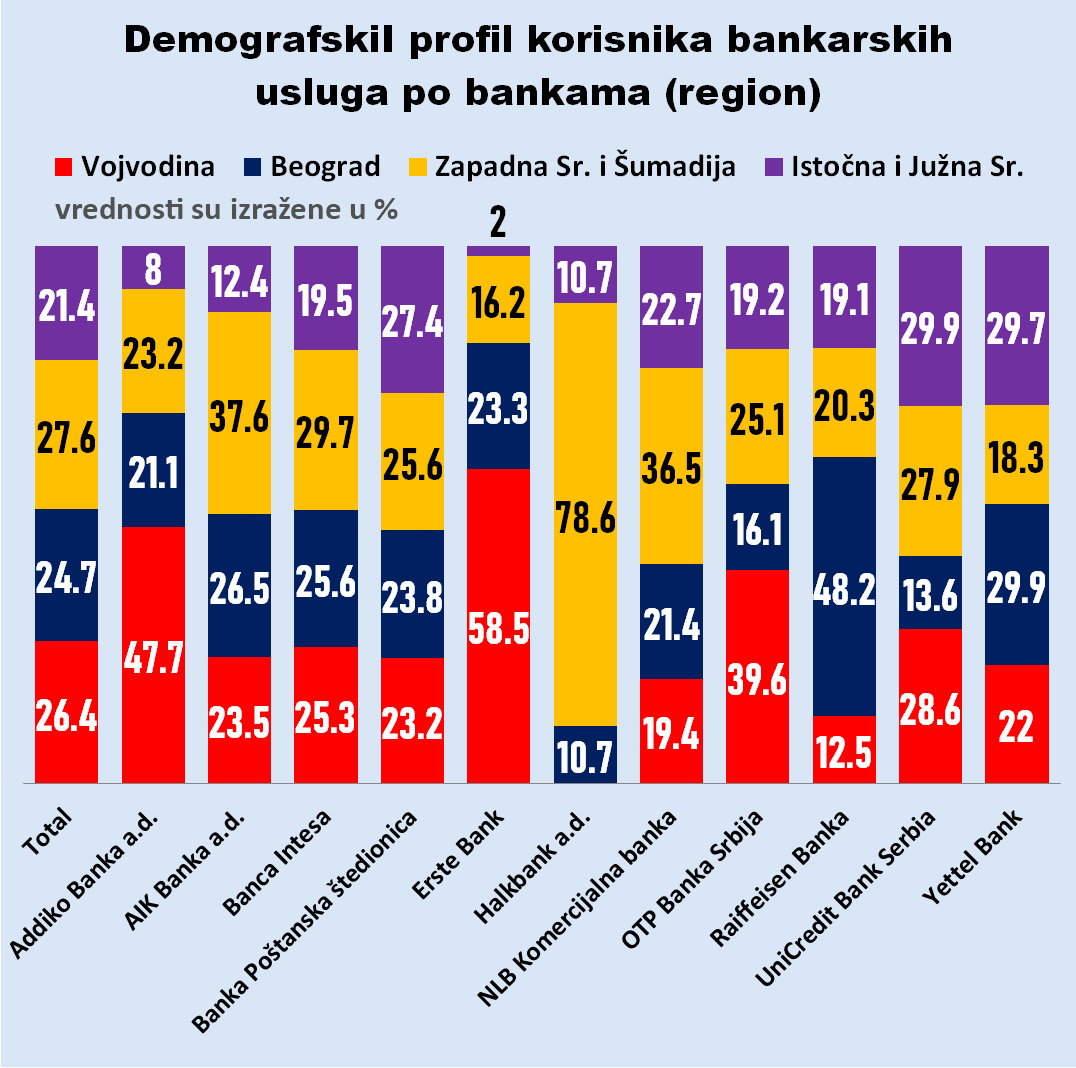 S druge strane, gotovo 6 od 10 korisnika Erste banke je iz Vojvodine, odakle je i skoro polovina korisnika Addiko banke, kao i 4 od 10 korisnika OTP banke. Istraživanje pokazuje i da iz Južne i Istočne Srbije dolazi po 3 od 10 korisnika Poštanske štedionice i Yettel banke a da skoro 8 od 10 korisnika Halkbanke dolazi iz Zapadne Srbije i Šumadije, što jeste razumljivo jer je njen sadašnji turski istoimeni vlasnik nasledio strukturu bivše Čačanske banke.