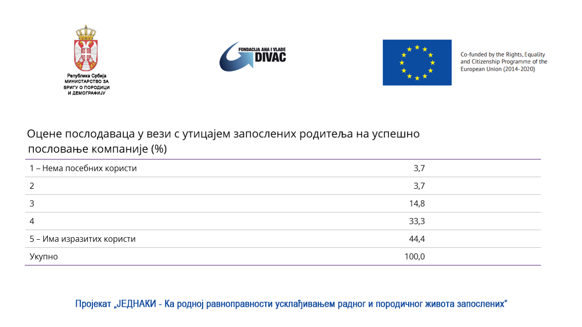- Svaki drugi poslodavac (55,5 odsto) smatra da dužina porodiljskog odsustva ne predstavlja problem za poslodavca, dok je 44 odsto poslodavaca prepoznalo porodiljsko odsustvo kao izazov sa kojim se moraju suočiti i pronaći način za preraspodelu radnih aktivnosti. Nijedan poslodavac ne smatra da porodiljska odsustva zaposlenih majki mogu ozbiljno ugroziti proces proizvodnje i da za njih predstavljaju ozbiljan problem, navodi rezultate istraživanja Jovanović.