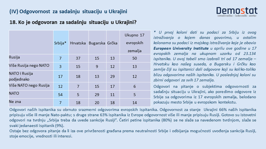 Demostat je u junu obavio istraživanje o spoljno-političkim stavovima građana, u kojem je jedno pitanje - „Ko je odgovoran za aktuelnu situaciju u Ukrajini", preuzeto iz aprilskog istraživanja EUI. Odgovor je u oba istraživanja jasan - 66 odsto ispitanika u Srbiji smatra da je za rat u Ukajini u velikoj meri ili isključivo odgovoran NATO, dok 63 odsto ispitanika u zemljama EU i u Velikoj Britaniji odgovornost u većoj meri ili isključivo pripisuje Rusiji. I iako postoje građani u evropskim državama koji smatraju da je NATO glavni krivac, taj procenat je daleko manji od onog koji je zabeležen u Srbiji.