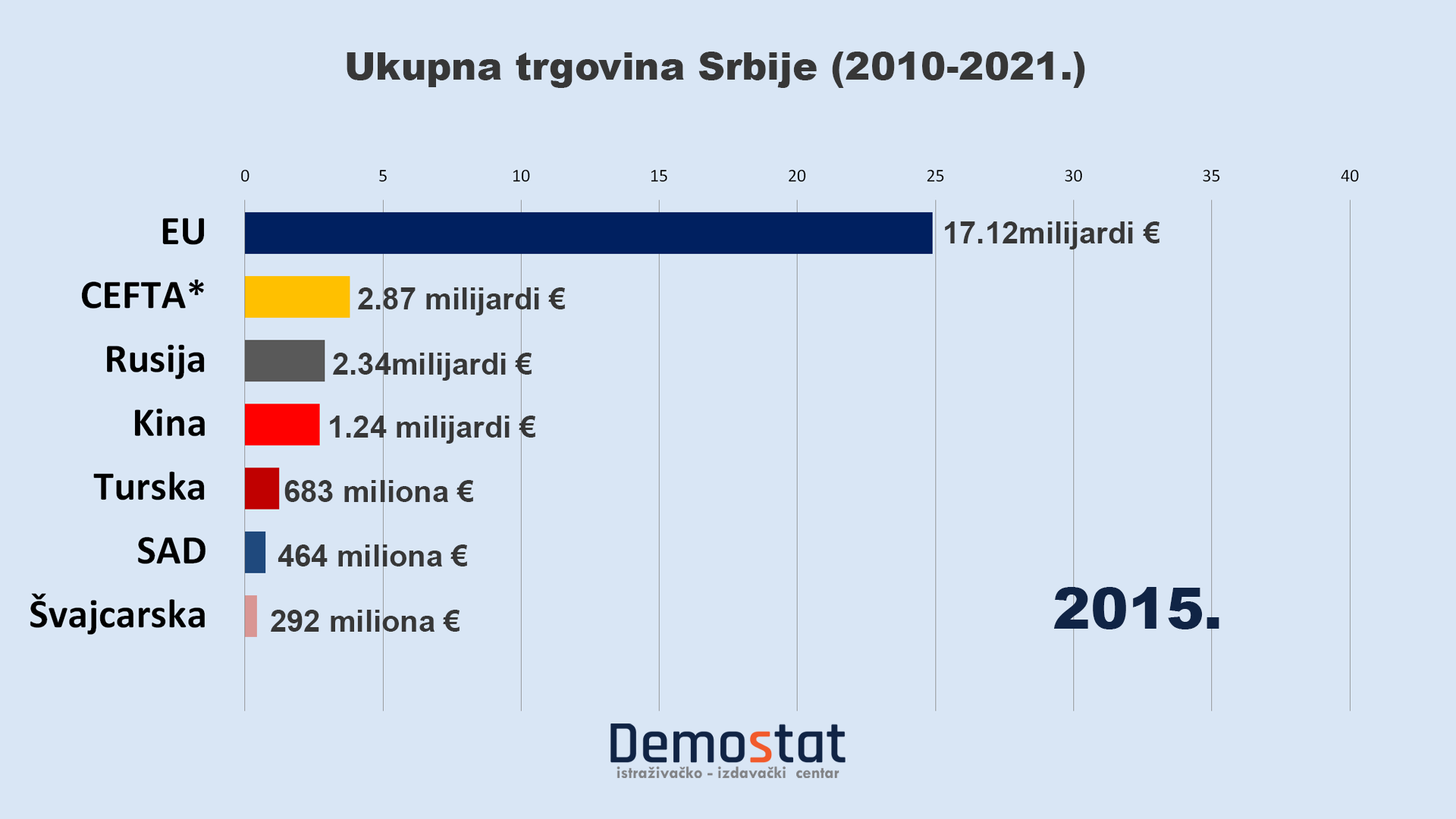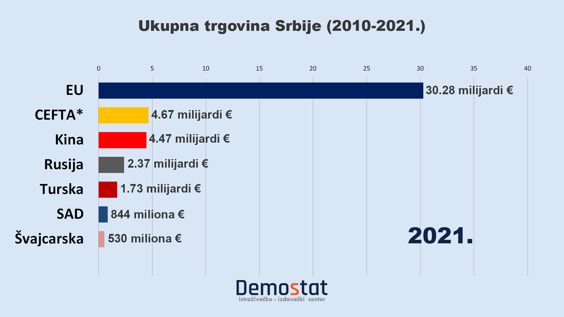 Konačno, 2021. godine spoljnotrgovinska razmena sa Evropskom unijom dostigla je 30,28 milijardi i tako potpuno i nedvosmisleno dominantno zacementirala svoju poziciju najvećeg spoljnotrgovinskog partnera Srbije, dok su sve ostale zemlje zadržale svoju prethodno stečenu poziciju po obimu spoljnotrgovinske razmene. Drugoplasirani partner Srbije po vrednosti robne razmene ostaju zemlje CEFTA sporazuma i nakon 11 godina, ali u obimu koji je 2021. godine za prvoplasiranom Evropskom unijom zaostajao za preko neverovatnih 25 milijardi evra.