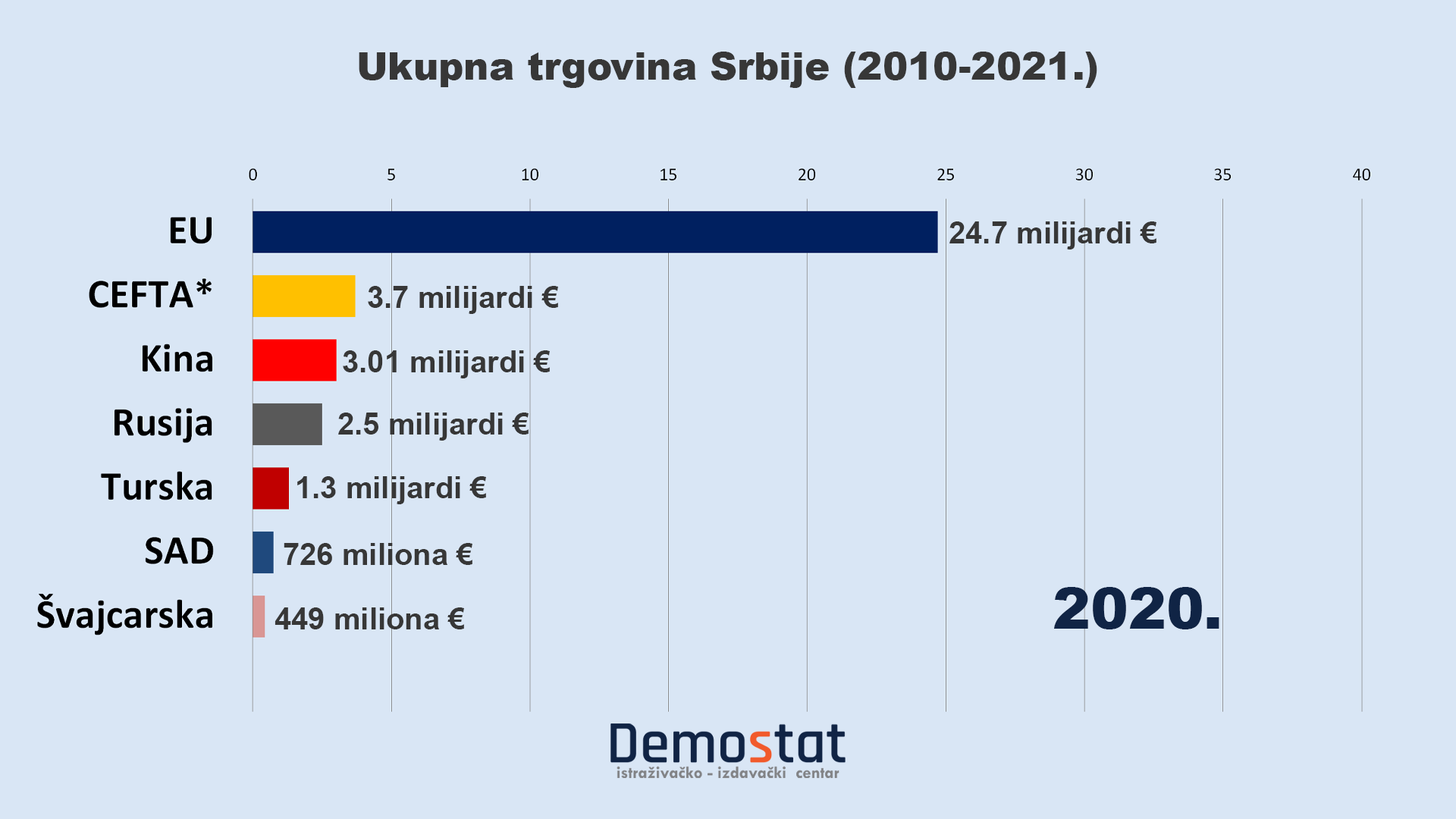 Podaci o trgovinskoj razmeni sa Evropskom unijom objavljeni od strane Evropske komisije i Međunarodnog monetarnog fonda, te Zavoda za statistiku Republike Srbije nedvosmisleno pokazuju da se ukupna trgovina Republike Srbije od 2010. do 2021. godine odvijala oko Evropske unije, kao okosnice srpske spoljnotrgovinske razmene.