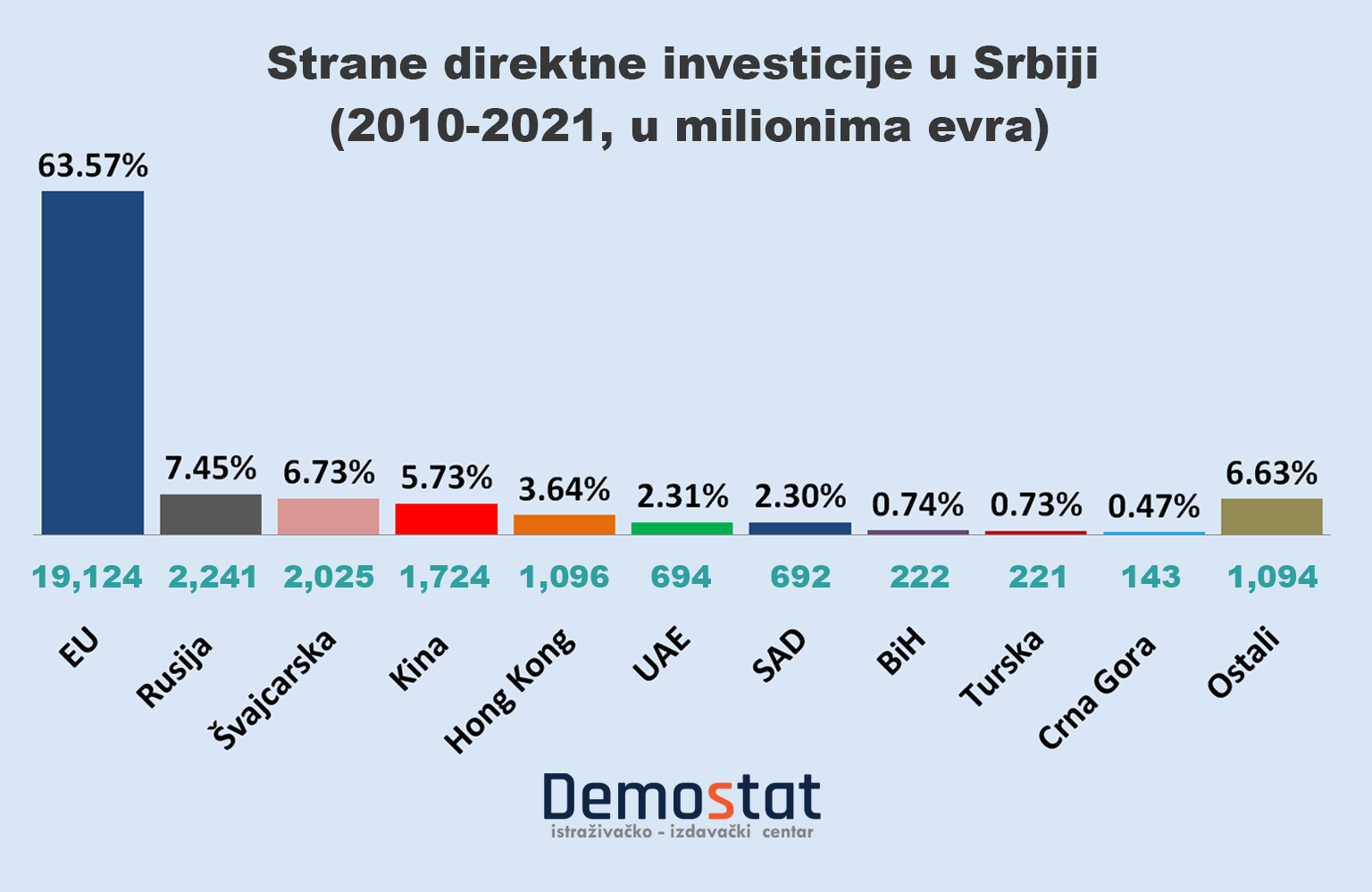 Konačno, kada je reč o ništa manje bitnim stranim direktnim investicijama u Srbiji, a prema zvanično objavljenim podacima Narodne banke Srbije, u periodu od 2010. do 2021. godine daleko najviše stranih direktnih investicija u Srbiju je stiglo upravo od kompanije iz Evropske unije. Štaviše, u ovom periodu od jedanaest godina od ukupnog broja stranih direktnih investicija u Srbiji preko 63% investicija došlo je od strane kompanija sa sedištem u Evropskoj uniji.