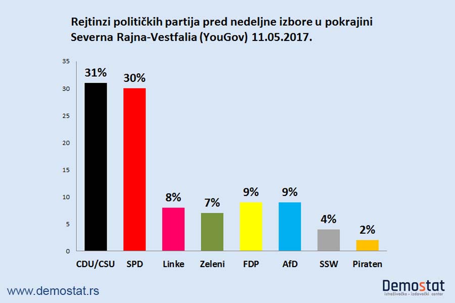 Prognoze u Severnoj Rajni-Vestfaliji predviđaju borbu “prsa u prsa”, jer istraživanja javnog mnjenja kažu da bi SPD mogao da dobije 32 odsto glasova, a CDU tek nešto manje, odnosno 31 odsto.