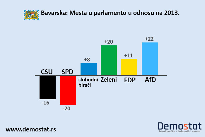 Najveći uspeh postigla je partija Zelenih, koja je duplirala broj glasova i sa 18 odsto postala druga partija u Bavarskoj. Slobodni glasači, konzervativna politička formacija okrenuta regionalnim temama koja je nastala 2009. godine, uzela je deo glasova od razočaranih simpatizera Hrišćansko-socijalne unije, koja je izgubila većinu. Koalicioni partner Merkelove ostaje glavna politička snaga u regiji, sa 37 odsto glasova, što je najgori rezultat koji je zabeležila od 1954. godine. Konzervativna partija koja je decenijama neprikosnoveno vodila regiju plaća greške pogrešne procene da će bolje proći ako se prikloni tvrdoj desnici. Prošlogodišnji proboj Alternative za Nemačku izazvao je paniku u njenim redovima, pa su krivicu za migrantsku krizu svalili na Angelu Merkel, iako im je ona saveznik u Berlinu.